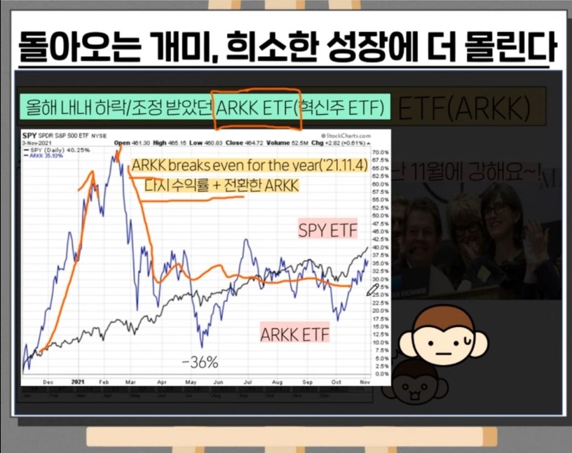 연말에 미국 주식 산타랠리가 변함없이 와줄지 궁금하네요. 7년 동안 11월 승률이 100퍼센트였다는 ARKK ETF는 이번에도 기록을 이어갈지요. 들어가고 싶어도 요즘 미국주식 너무 올라 무섭긴 하던데... 개미들이 모두 덤빈다면 그때가 팔때라는 격언을 지금 듣고 실행해야 하는 것인지도 고민입니다. 결과는 늘 지나고서야 알 수 있는 것이 어렵네요.