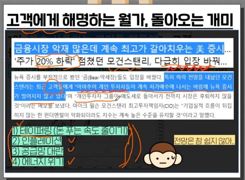 모건스탠리가 주가 20퍼센트 떨어진다고 고객에게 경고했었는데 이번엔 다급히 입장을 바꿔 "개미들이 사서" 뉴욕증시가 떨어지지 않고 있다. 개인투자자가 매도세로 돌아서기 전까지 시장은 후퇴하지 않을 것이다. 기업실적 흐름이 뒤집히지 않는 한 펀더멘털이 악화되더라도 지수는 계속 높은 수준을 유지할 것" 이라고 말했다.